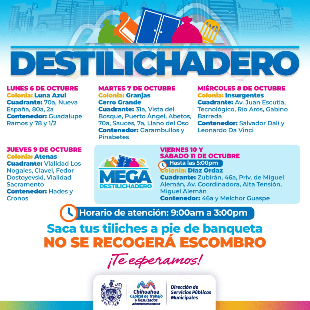 Chihuahua, Chih. – 4 de octubre de 2025. Con el objetivo de evitar acumulaciones de basura de grandes dimensiones en los hogares, que pueden propiciar plagas y problemas de salud, el Gobierno Municipal, a través de la Dirección de Servicios Públicos Municipales, dio a conocer el calendario del programa “Destilichadero” que se realizará del 6 al 11 de octubre en cinco colonias de la capital.