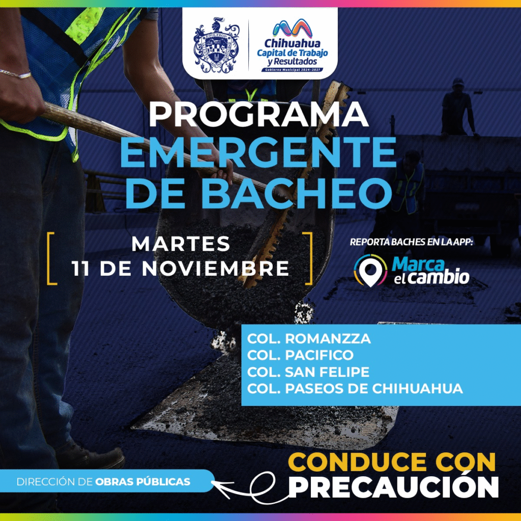 H. Ciudad de Chihuahua, Chih.— Con el amanecer del martes 11 de noviembre, el golpe rítmico de las cuadrillas de Obras Públicas volverá a escucharse en las calles de la capital. El Gobierno Municipal informó que se realizarán trabajos de bacheo en cuatro puntos estratégicos: Romanzza, Pacífico, San Felipe y Paseos de Chihuahua, como parte del programa emergente que se mantiene activo desde julio.