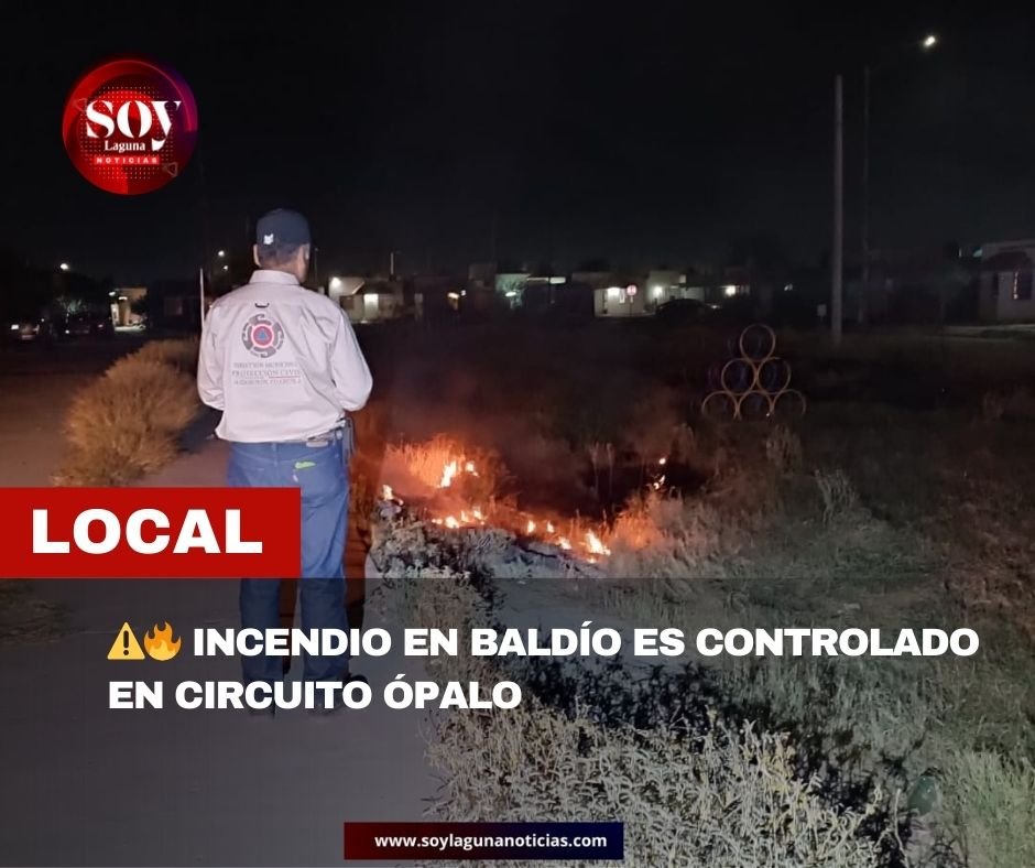 Torreón, Coahuila; 25 de noviembre de 2025. La tarde del martes, cuerpos de emergencia atendieron un incendio registrado en un lote baldío de maleza ubicado sobre Circuito Ópalo, en el municipio de Torreón.