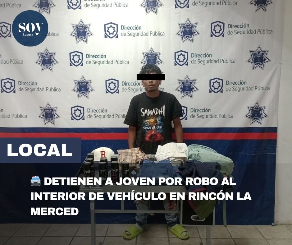 Torreón, Coahuila de Zaragoza.– Elementos de la Dirección de Seguridad Pública Municipal detuvieron a Armando Jared “N”, de 20 años de edad, por su presunta participación en un robo al interior de vehículo en la colonia Rincón La Merced.