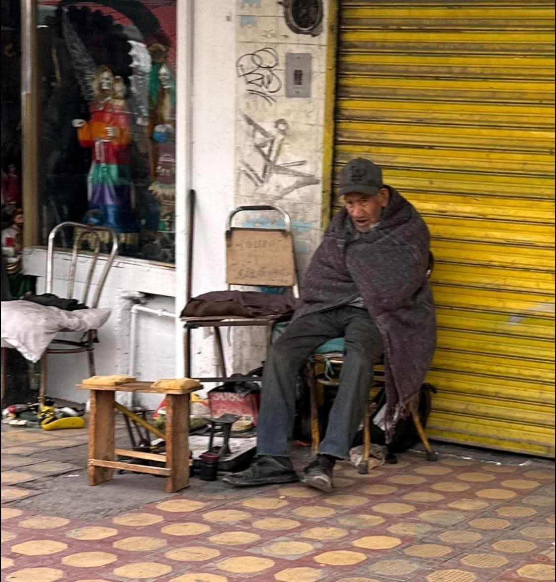 La mañana de este lunes, ciudadanos reportaron que Don Bolero se encuentra trabajando prácticamente solo, sin clientes y enfrentando el intenso frío que afecta a la región. Con su cajón, sus herramientas y una chamarra ligera, el hombre permanece en su sitio habitual esperando a quien necesite de su servicio.