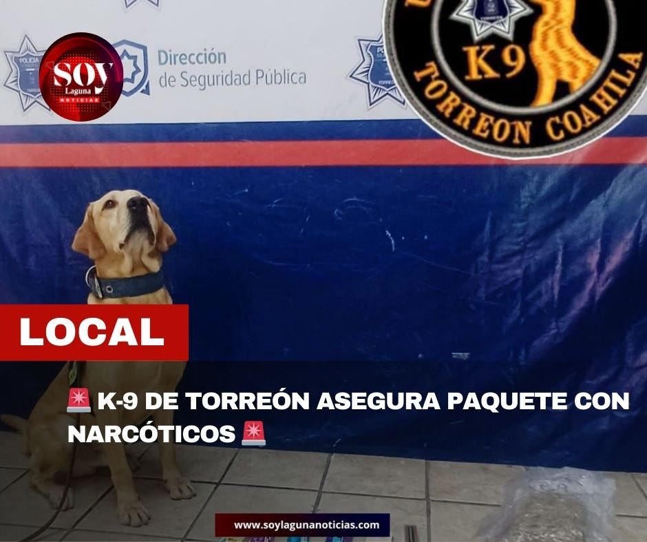 Torreón, Coahuila de Zaragoza; 06 de diciembre de 2025. — Elementos del Mando Coordinado Policial Torreón, adscritos a la Unidad Canina (K-9), realizaron el aseguramiento de un paquete con narcóticos durante un recorrido preventivo en una empresa de paquetería ubicada en la calle Adolfo Aymes #168-A, en Ciudad Industrial.