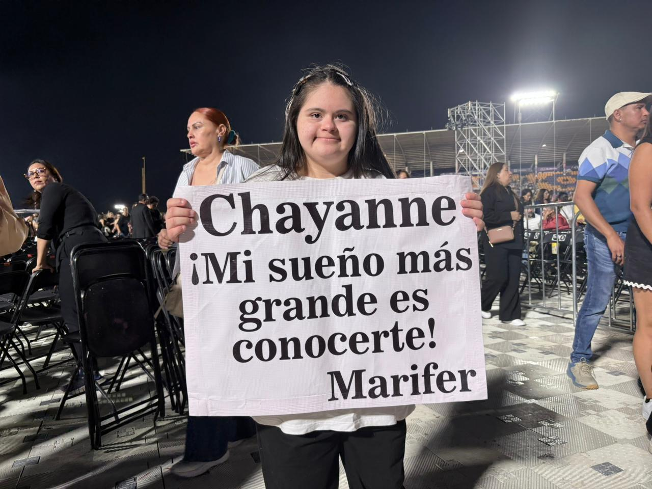 Desde las gradas, el equipo de staff y producción notó una lona que sobresalía entre el público con el mensaje: “Chayanne, ¡mi sueño más grande es conocerte! Marifer.” Al descubrir que pertenecía a una joven con discapacidad, el personal decidió ayudarla a acercarse al escenario.