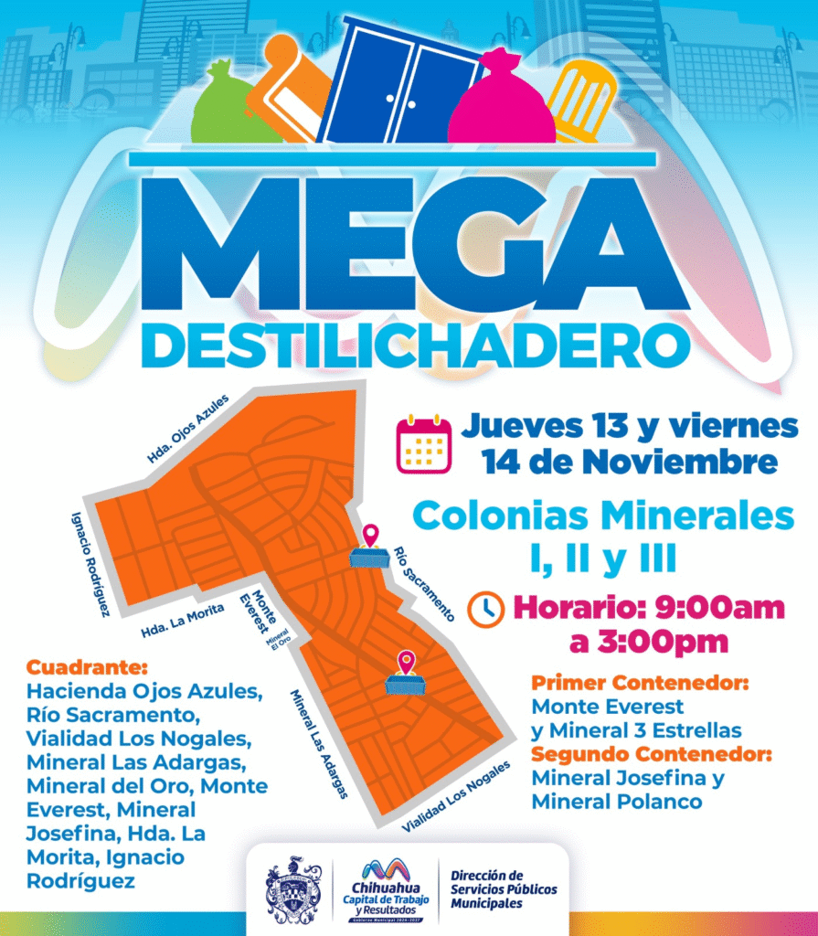 Chihuahua, Chih.– Vecinos de las colonias Minerales I, II y III, ¡atentos! Este jueves 13 y viernes 14 de noviembre el Gobierno Municipal llevará hasta sus calles el mega destilichadero, un operativo pensado para combatir la fauna nociva y eliminar acumulaciones de objetos en casas y terrenos baldíos.