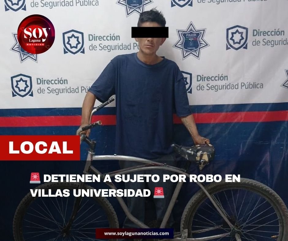 Torreón, Coahuila de Zaragoza a 17 de noviembre de 2025.- La Dirección de Seguridad Pública Municipal de Torreón informa que esta mañana se realizó la detención de un hombre señalado por el presunto delito de robo en la colonia Villas Universidad. Los hechos ocurrieron alrededor de las 11:20 horas, cuando agentes municipales circulaban sobre la calle Sevilla, en la cerrada Bugambilias, donde una mujer les hizo señas para solicitar su apoyo. La denunciante informó que minutos antes había dejado su bicicleta afuera de su domicilio y al salir nuevamente, se percató de que ya no se encontraba. De acuerdo con la afectada, varios vecinos le señalaron a un hombre como la persona que habría tomado la bicicleta, mismo que se encontraba aún cerca del lugar. Ante esta información, los agentes se aproximaron al individuo identificado como Alfonso Daniel “N”, de 26 años, a quien la mujer solicitó formalmente detener. Por lo que los oficiales procedieron a su aseguramiento. En el sitio se recuperó una bicicleta color gris cromado, sin marca visible, misma que fue puesta a disposición del Ministerio Público junto con el detenido.