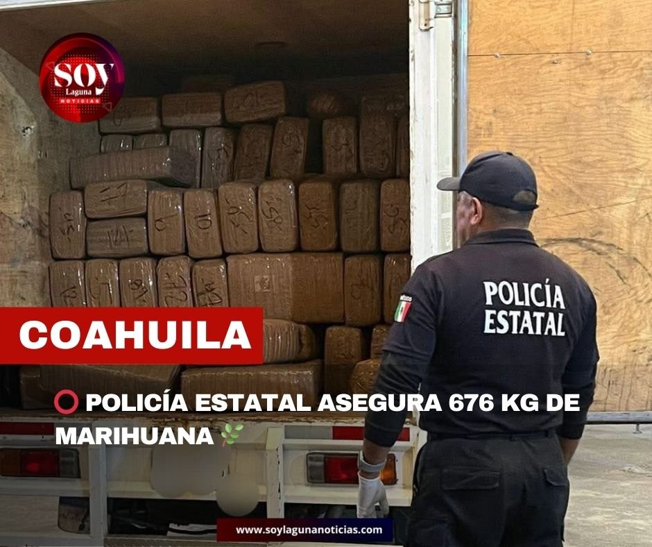 Saltillo, Coahuila. — Elementos de la Policía Estatal aseguraron 676 kilogramos de marihuana durante una revisión en el filtro de seguridad instalado en la carretera Saltillo–Matamoros, a la altura del balneario Los Mezquites.