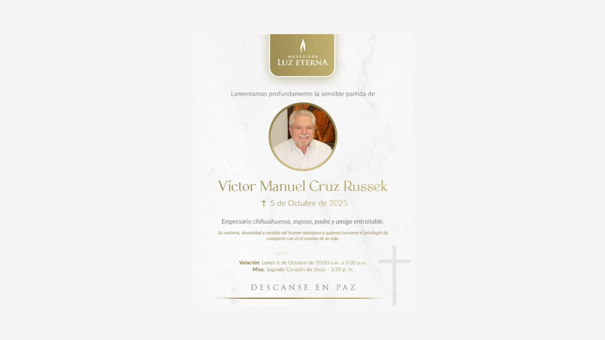 Desde SOY Chihuahua extendemos nuestras condolencias a la familia y amigos de Don Víctor Cruz Russek. Su legado permanecerá en la memoria de quienes lo conocieron y apreciaron su labor.